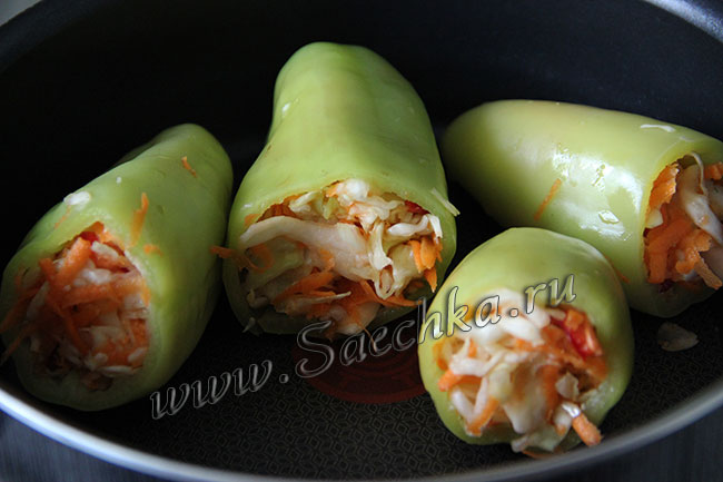 - Капусту с морковкой посолить, перетереть руками, а затем туго ими нафаршировать перцы, уложить в сотейник.