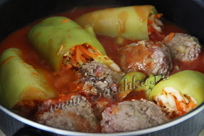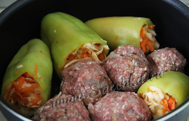 - Вымешать фарш, сформировать круглые тефтели и уложить в сотейник рядом с перцами, фаршированными овощами.