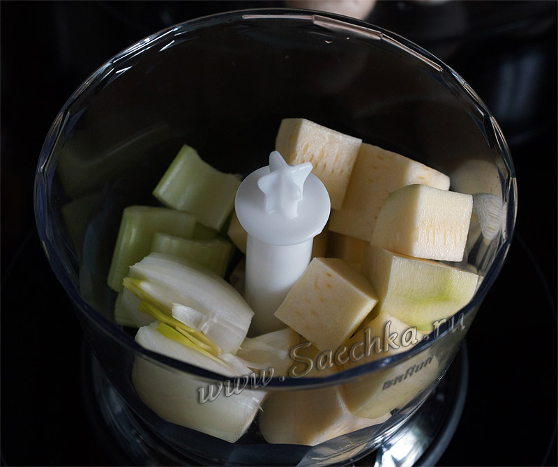 - Лук, сельдерей и кабачок измельчить.