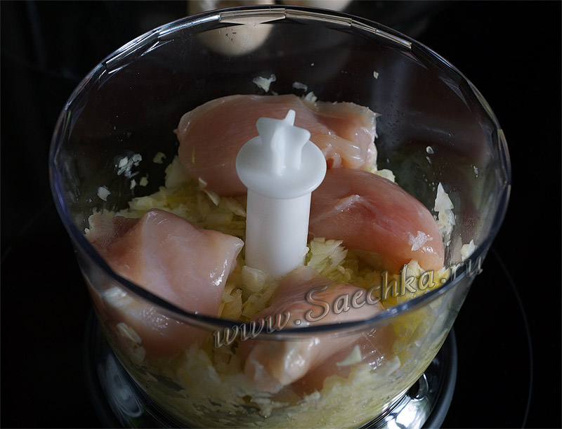 - Курицу можно мелко нарезать, чтобы был рубленый фарш. Мне было лень, поэтому тоже измельчила блендером.