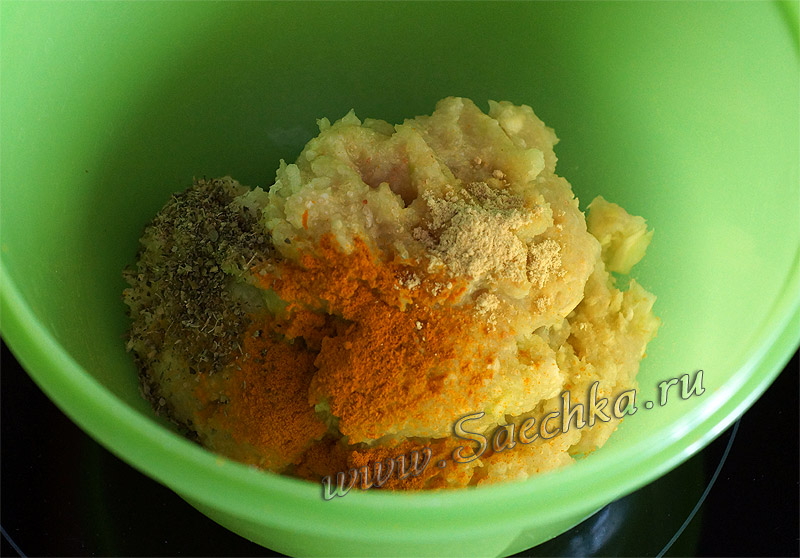 - К курино-овощной смеси добавить карри, майоран, горчицу. Посолить и перемешать.