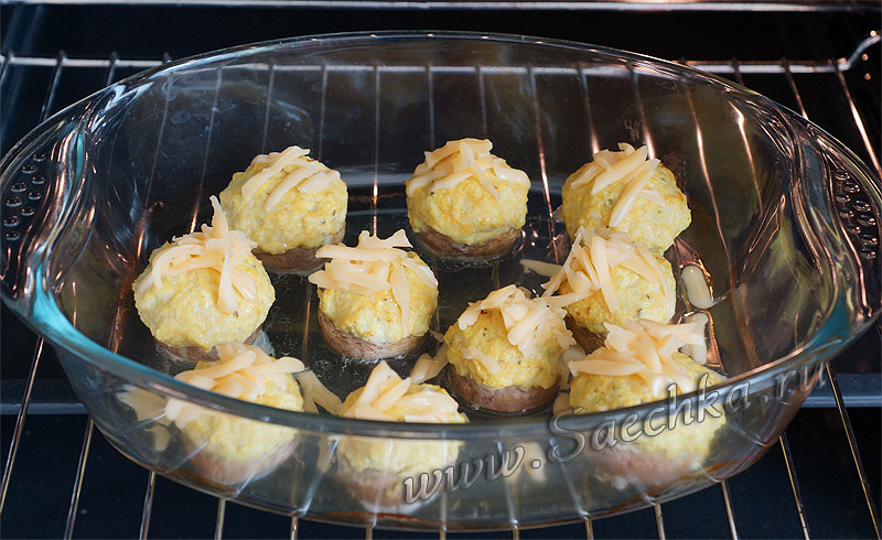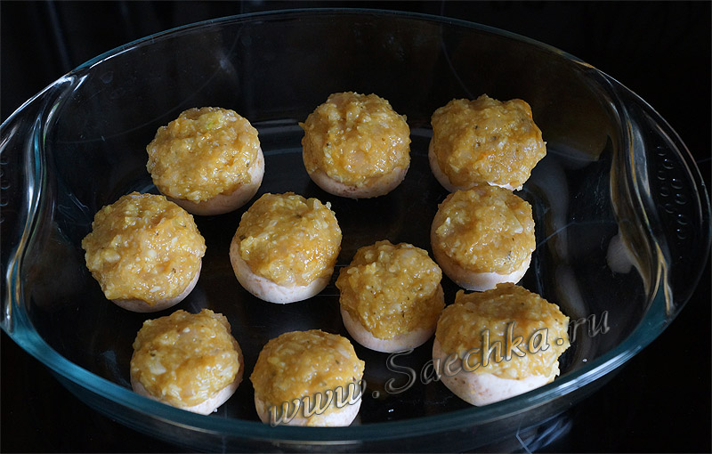 - Нафаршировать шляпки шампиньонов получившимся фаршем.