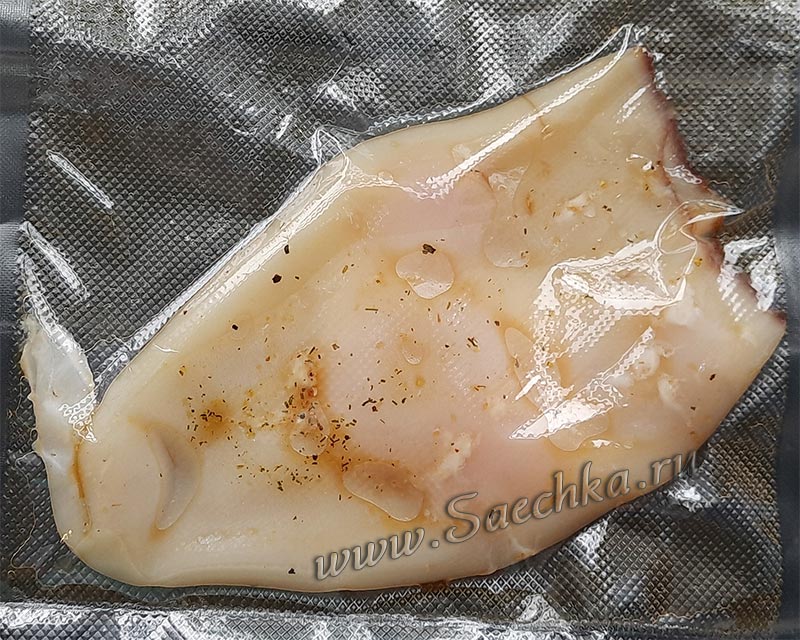 - Нафаршировать сыром и нарезанным на кусочки помидором черри. Обмазать соевым соусом, посыпать специями. Вакуумировать.