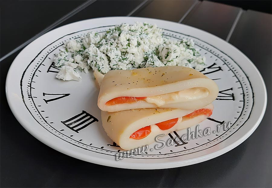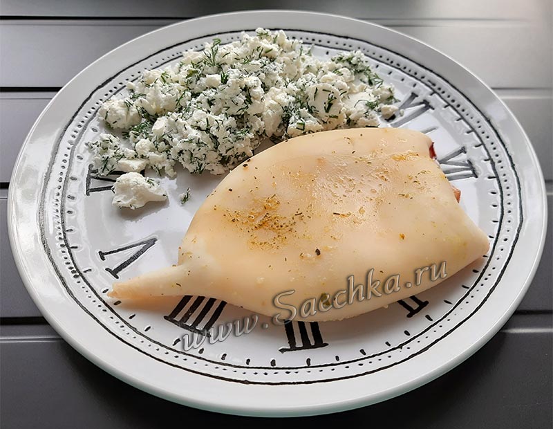 - Сыр из кальмара не вытек, что меня порадовало. Подавала с размятой брынзой и мелко нарезанным укропом.