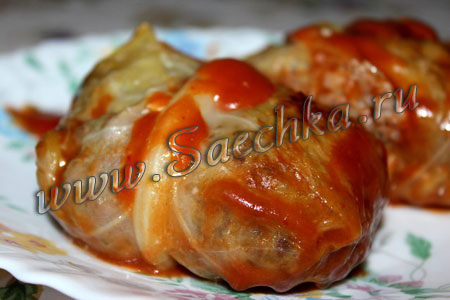 - За 5 мин. до готовности добавить к голубцам соус: вода (70 мл), томатная паста (2 ч.л.), 1/2 ч.л. соли, 2 ст.л. сахара, 1 ст.л. муки.