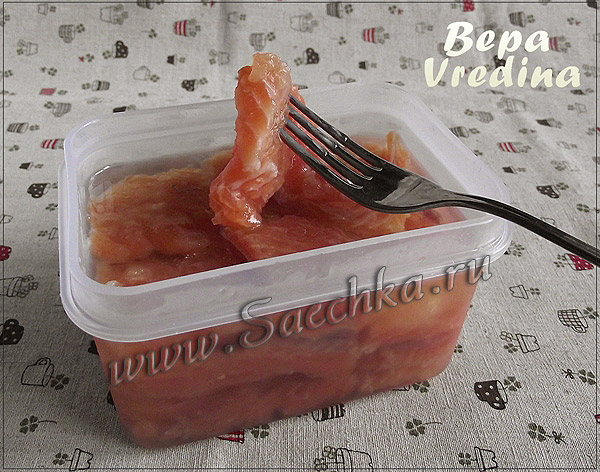 - Филе порезать небольшими кусочками (5 см), обмакнуть в соль с обеих сторон. Уложить слоями в банку (мясо к мясу) и оставить в холодильнике на 8 часов.