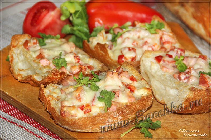 - Разрезаю чиабатту на четыре части, выкладываю начинку на каждый кусок, посыпаю сыром и ставлю в духовку. А в это время варю себе кофе, затем достаю готовые горячие бутерброды из духовки и...
