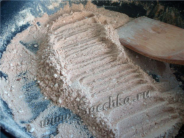 - Пока варятся грибы, на сухой сковороде рассыпать тонким слоем муку и, непрерывно помешивая, жарить до выраженного бежевого цвета - обычно это около 7-10 минут.