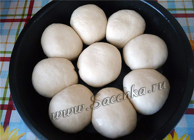 - Разделить на 9 (7) кусочков: причем 8 (6) равные по весу, 1 чуть больше (это будет середина хлеба). Скатать из них круглые булочки.