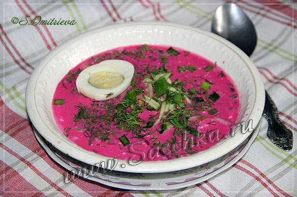 - В каждую тарелку наливаю из кастрюли порцию свеклы с жидкостью, добавляю нарезанную зелень, огурец и половинку или четвертинку яйца.
