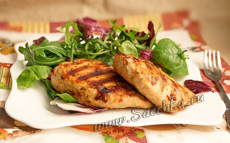 Индейка приготовлена на гриле и подаётся к столу с овощным салатом.