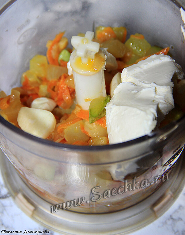 - Когда овощи остыли, положила их в чашу блендера, добавила три зубчика чеснока и пару хороших ложек творожного сыра. Блендером превратила всё в пюре. По вкусу досолила.