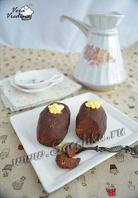 Пирожное «Картошка» приготовлено из бисквита со сливками и шоколадом.