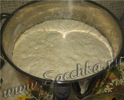 - Получившееся тесто выложить в большую чистую миску или кастрюлю, покрыть плёнкой или полотенцем и оставить на 18-24 часа. Можно даже на 12, но не на меньше. Я выдержала 12 часов. За это время тесто поднимется, но будет жидким с большими пузырьками.