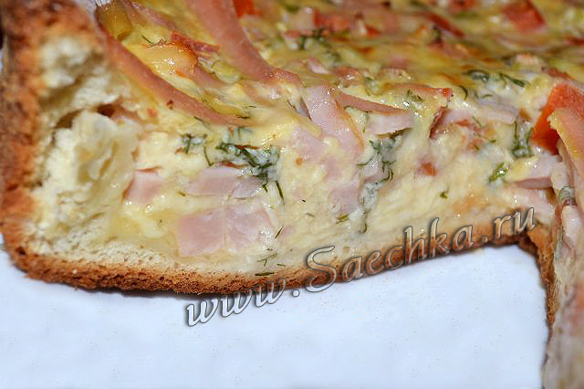 - Дать пирогу с ветчиной и сыром остыть в форме. Затем разрезать и подать к столу.