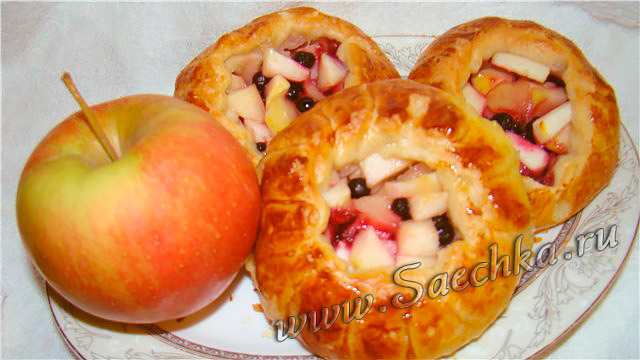 Корзиночки приготовлены из слоёного теста с яблочной или ягодной начинкой.