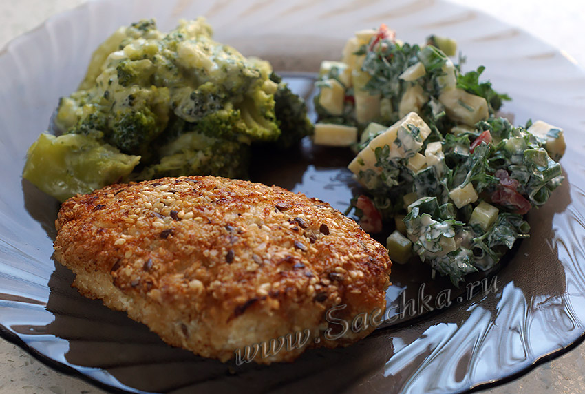 - В этот раз себе к котлетам на гарнир потушила капусту и приготовила салат.