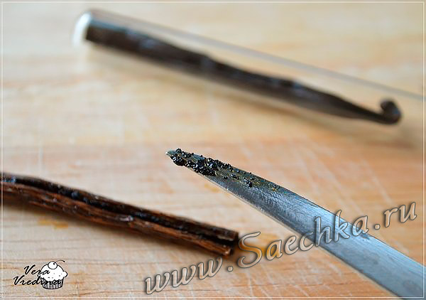 - Стручок ванили нужно разрезать вдоль, выскрести семена и положить их в ковш с молоком. Стручок кидаем туда же!