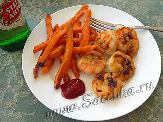 Креветки в пикантном соусе «Хэтч» вкусны с рисом, сваренным на кокосовой воде, или же, как у меня, со сладким картофелем фри.