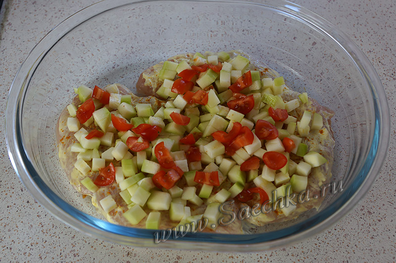 - На куриную грудку накидать нарезанные кубиками овощи. Слегка присолить. Кстати, вкусно добавить ещё прованские травы.