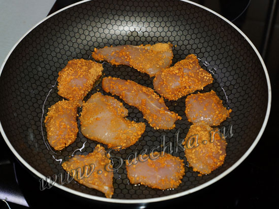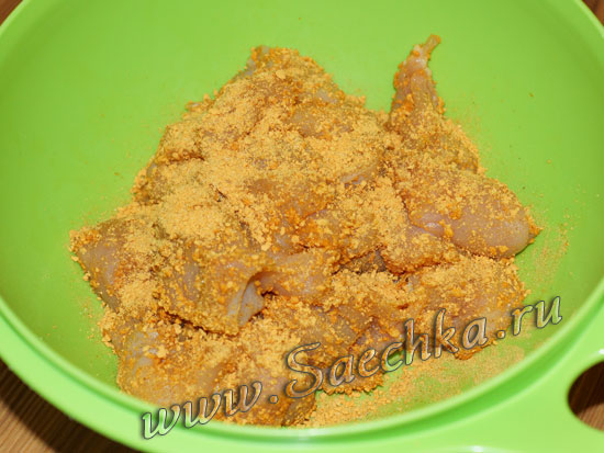 - Засыпаем панировкой (состав: сухари, чеснок, сухое молоко, сладкий перец, яичный порошок, куркума, кориандр, пажитник, имбирь, зира, корица, перец чили, горчица, гвоздика, мускатный орех, анис):
