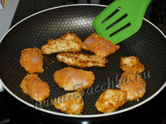 - Выкладываем наши домашние куриные наггетсы на сковороду: