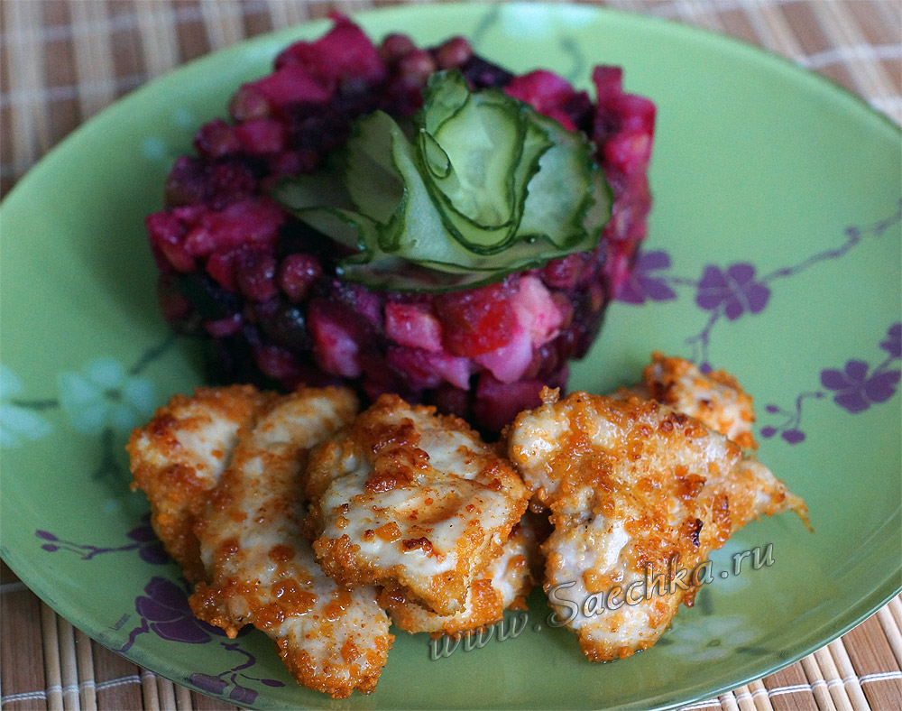 - Подавали наггетсы куриные с винегретом, можно подать с соусом.