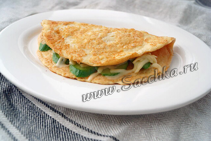 - На одну половину выложить начинку: огурцы кружочками, сверху сыр тёртый, а второй половиной накрыть. Можно минутку-две подержать на сковороде: сыр слегка расплавится. Вкусно!