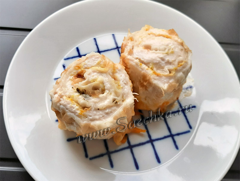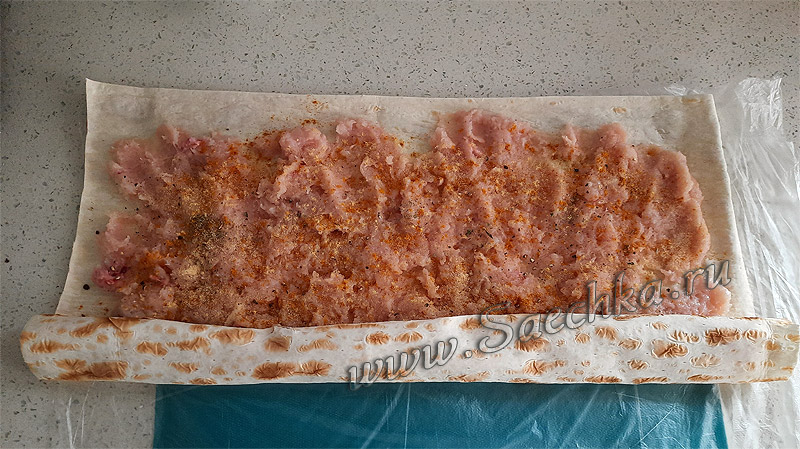 - Куриную грудку смолоть в фарш, выложить ровным слоем на лаваш. Посолить, поперчить, посыпать карри. Свернуть рулетом.
