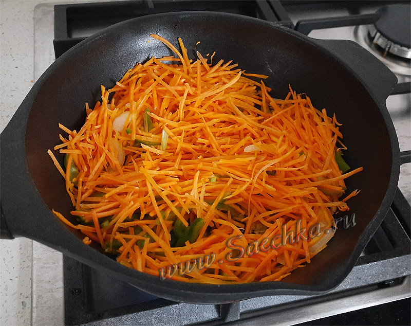- На оливковом масле обжарить нарезанный полукольцами лук и измельчённый чеснок. Добавить натёртую морковь и нарезанный болгарский перец. Слегка обжарить и влить кетчуп с водой.
