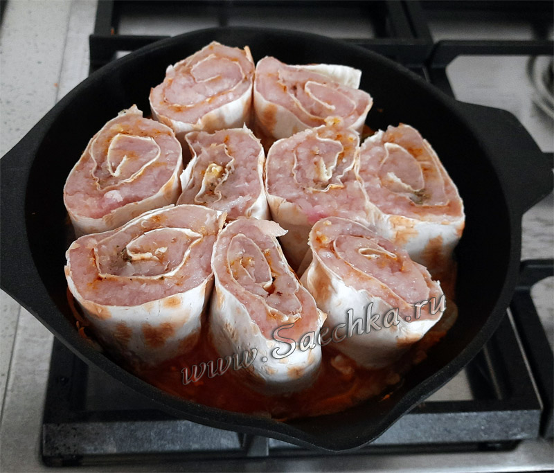 - Выложить нарезанный кольцами лаваш с фаршем. Закрыть крышкой.