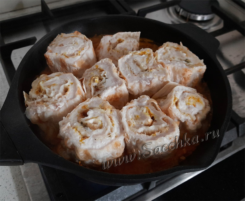 Крайне ленивым способом штрули приготовлены на овощной «подушке» из куриного фарша с лавашем. Достаточно потушить минут 10, я же готовила на газу, поэтому моё блюдо томилось под крышкой полчаса так точно.