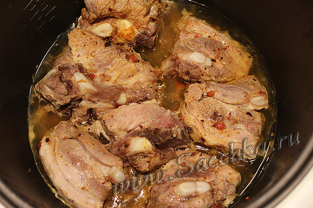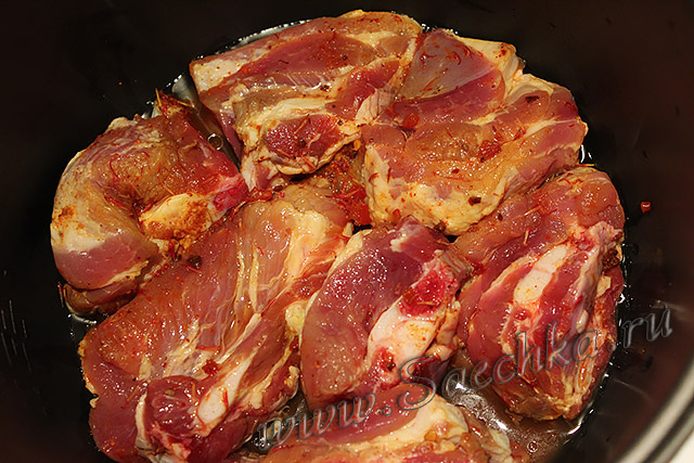 - Маринованное мясо сложить в чашу мультиварки. Добавить растительное масло.