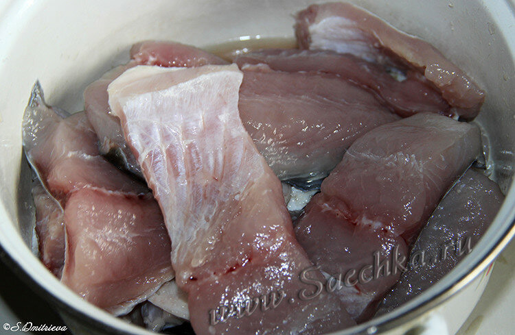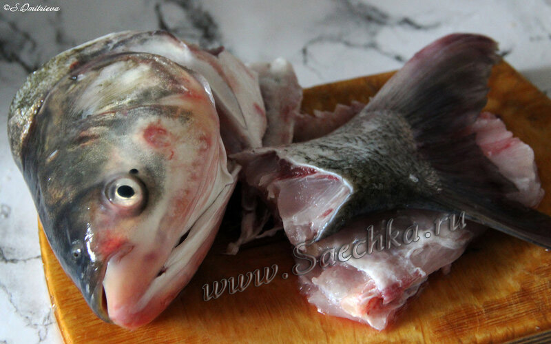 - Рыбу хорошо промываю, чищу, потрошу, отделяю голову, хвост и хребёт (это на суп), филе на коже режу на небольшие кусочки.