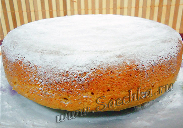 - После выпечки остудить с открытой крышкой до теплого состояния, затем выложить кекс на тарелку и посыпать сахарной пудрой.