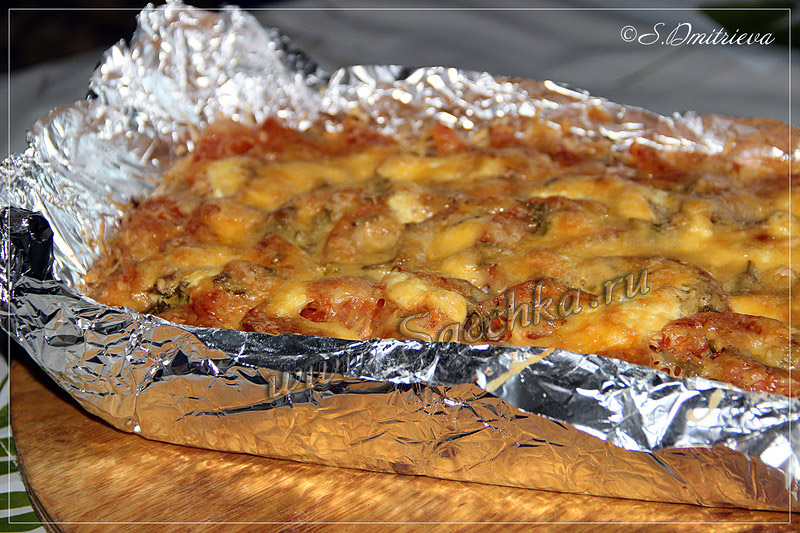 - Сверху выкладываем тонко порезанные помидоры. Засыпаем натёртым сыром.