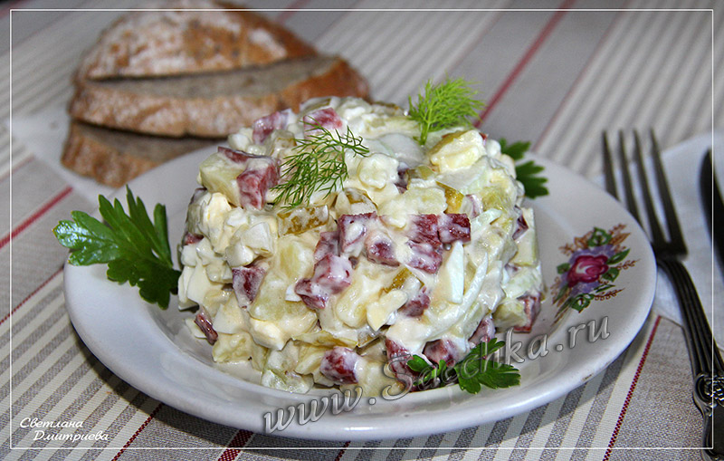- Солёный огурец и копчёные колбаски нарезать так же кубиками. Лук - слайсами.