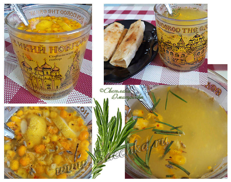 - Затем можно процедить через ситечко, я ничего этого не делаю, мне не мешает, так иногда ветки розмарина откину. Ну и можно подсластить по вкусу.