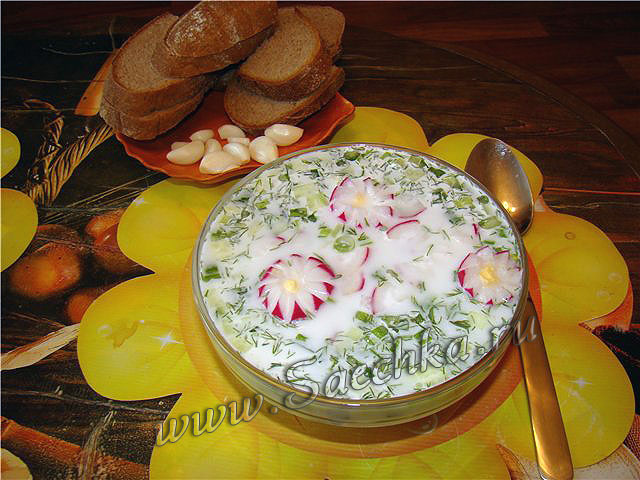 - Курицу, яйца, картофель, огурцы, дайкон и зелень для окрошки мелко нарезать, залить охлажденным кефиром (или напополам с минералкой).