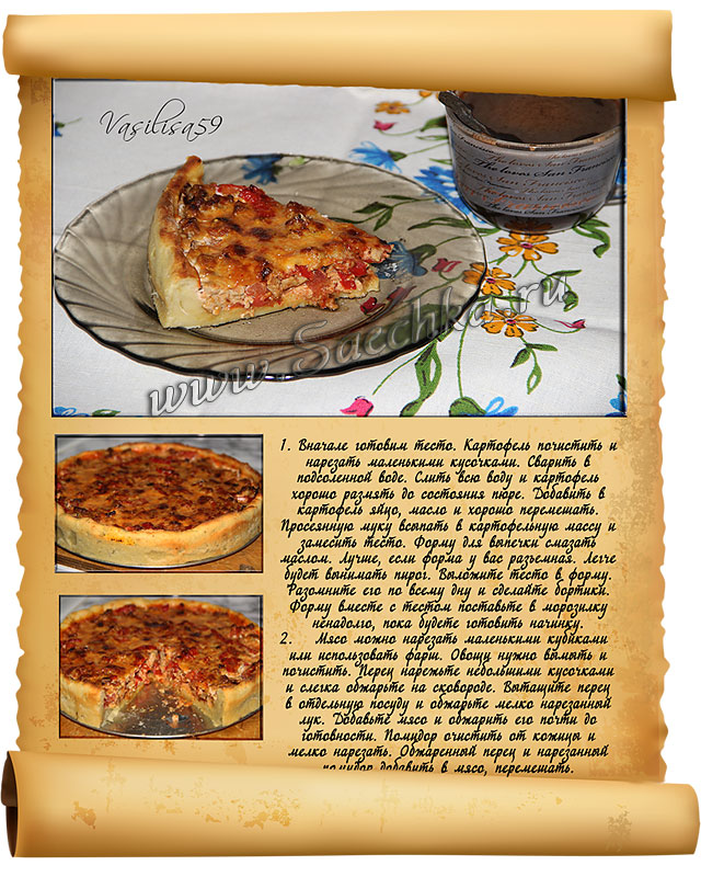 Попался в интернете рецепт, очень заинтересовал. Приготовила, понравился очень мясной пирог, спасибо автору!