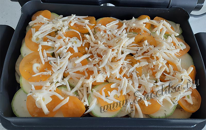 - Морковь, баклажан, кабачок и помидоры нарезать кружочками. Сыр натереть на крупной тёрке.