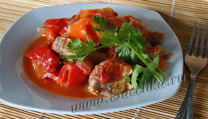 Паприкаш по-венгерски приготовлен из свинины или курицы с болгарским перцем, морковью и помидорами.