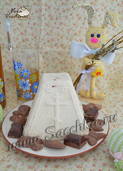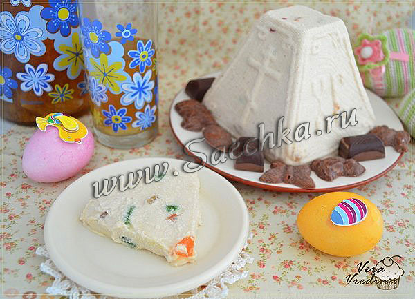 Творожная пасха приготовлена с цукатами и абрикосовым джемом.