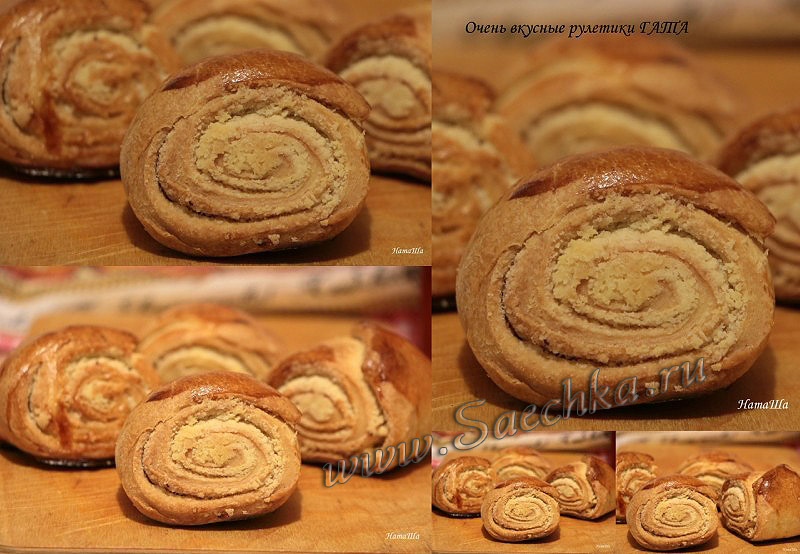 - Нарезать рулет на небольшие кусочки и выкладывать на противень. Каждый маленький рулетик смазать болтушкой (желток + молоко).