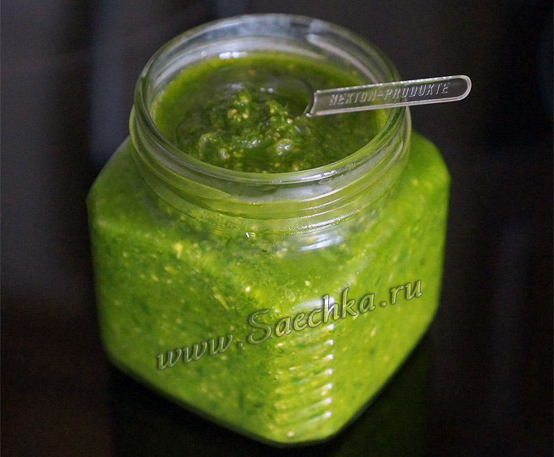 - Хранится соус песто в холодильнике около недели. Если использовать не успели, то можно заморозить на зиму.