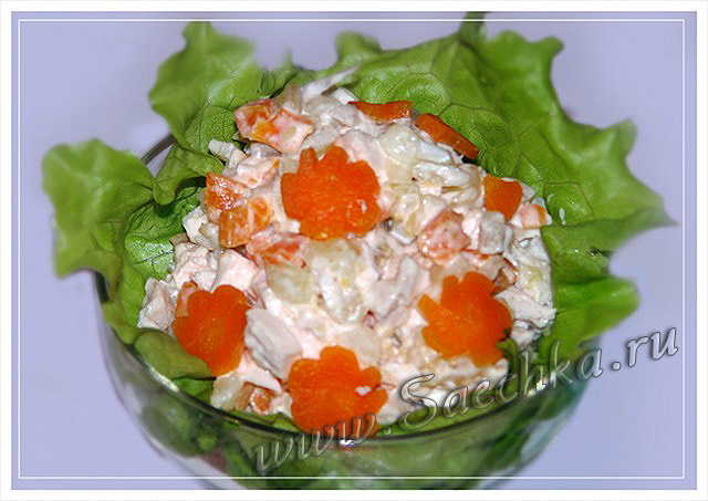 Совсем будничный домашний салат с курицей под названием «Пеструшка». Здесь возможны варианты: