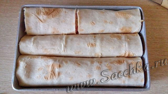 - Уложить рулеты - можно спиралью, если форма круглая. У меня форма прямоугольная, я уложила рядком.