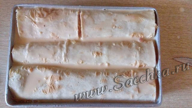 - Этим соусом залить сверху рулеты из лаваша. Заполняем все свободные места, можно немного пошевелить рулеты вилкой, чтобы смесь заполнила пустоты. Так же пролить смесью и по краям.