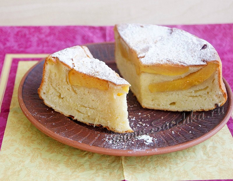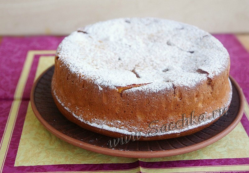 - Достать из духовки и оставить в форме на 5-10 минут. Чуть остывший пирог накрыть блюдом, большим по размеру, перевернуть, посыпать сахарной пудрой, нарезать на кусочки и подать к чаю.