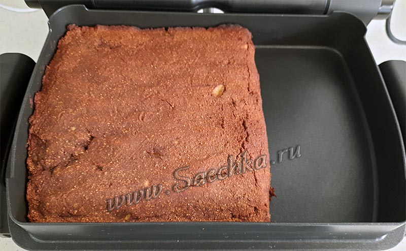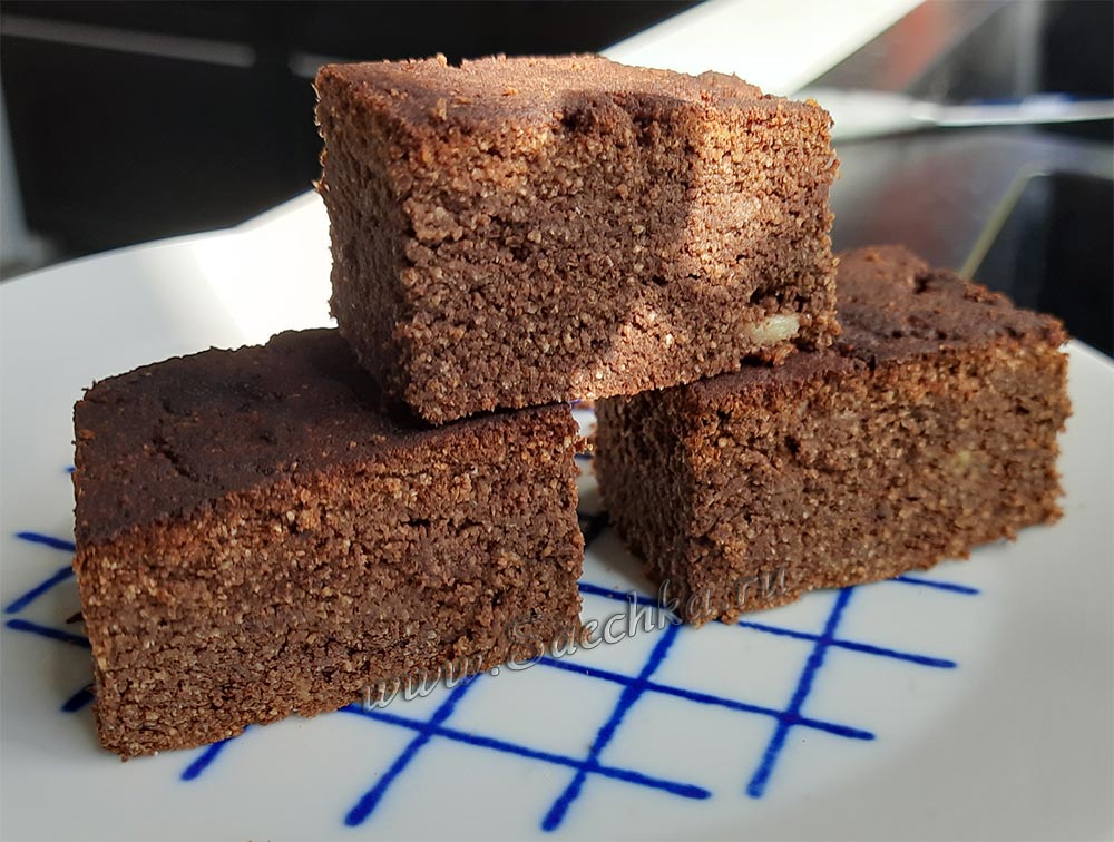 Пирог с бананом приготовлен с кокосовой мукой в оптигриле. Собственно, из-за неё и получился не влажный брауни, а посуше. Но всё равно из-за привкуса кокоса получилось очень вкусно.